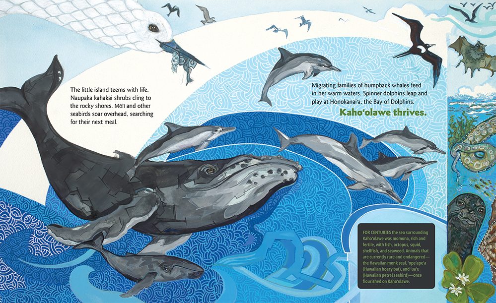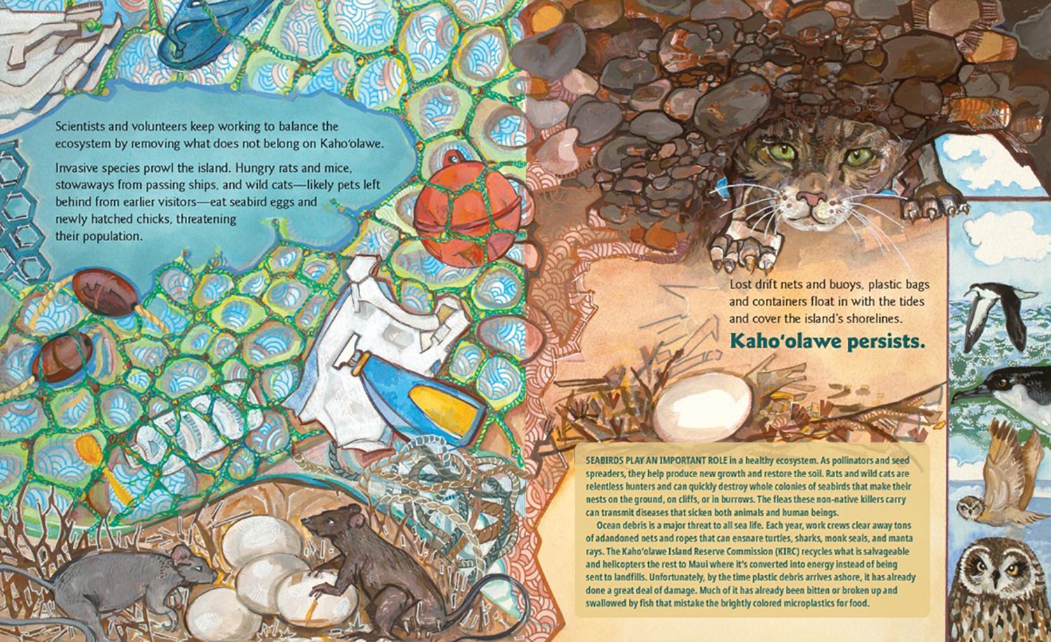 - Book illustration by Haranani Orme, pages 24 and 25, “illustration © Haranani Orme for Kaho’olawe, written by Kamalani Hurley, published by Carolrhoda Books